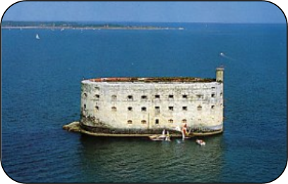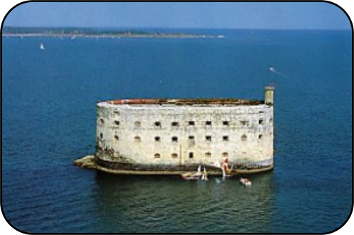 Fort BOYARD en Chiffres : Il s'agit de bâtir un cuirassé de pierre sur un enrochement. Ces travaux débutent, en 1804, à un peu plus de 5 mètres de profondeur. A la forme d'un anneau de pierre elliptique. Long de 80 mètres. Large de 40 mètres environ. Construit sur 3 niveaux. Comporte des casemates et une cour intérieure. L'établissement de Boyard ville, à la pointe nord-est de l'Ile d'Oléron, est aménagé. Les magasins de matériaux, les ateliers et les logements des ouvriers y sont regroupés. Un plateau de 100 mètres de long sur 50 mètres de large doit établir l'édifice. Les difficultés rencontrées par les architectes et par les ouvriers sont innombrables. L'enrochement s'affaisse sous le poids de la construction. De violentes tempêtes, telles que celles qui ravagèrent le littoral entre 1807 et 1808, détruisent une partie des travaux. Et la présence de la flotte anglaise constitue, en outre, une menace permanente. Elle retarde le chantier et cause parfois d'importants dommages. En 1808, l'Empire vient de subir deux défaites, l'une en Espagne, l'autre au Portugal. Le Général Dupont et son état-major rentrent à Rochefort. La ville y abrite, sur les rives du Fleuve Charente, l'un des ports français les plus actifs. La flotte anglaise renforce sa pression sur les îles et sur le littoral atlantique. Lorsque le 12 avril 1809, l'escadre destinée à secourir les Antilles est anéantie aux portes du Département, dans la rade de l'Ile-d'Aix, Fort-Boyard sort à peine des eaux. La protection d'un des principaux arsenaux de France. Situé à mi-chemin entre l'Ile-d'Aix et l'Ile-d'Oléron, Fort-Boyard a été conçu pour protéger la rade de l'Ile-d'Aix et l'Arsenal de Rochefort. Il vient renforcer le système de défense édifié le long du littoral et sur les îles de l'actuelle Charente-Maritime. Napoléon avait décidé que le fort serait élevé aux portes d'un des plus précieux arsenaux de l'Empire, sur le banc de sable de la “longe de Boyard”. Un projet né au XVII ème siècle. La protection militaire de l'Arsenal de Rochefort apparaît essentielle dés l'achèvement de sa construction, en 1666.Le banc de sable est repéré, étudié, sondé. La profondeur et la nature des fonds font l'objet de relevés détaillés. Sébastien Le Prestre de Vauban, futur Commissaire Général des Fortifications du royaume (1678), fait bientôt connaître au Roi Louis XIV son point de vue: "Sire, il serait plus facile de saisir la lune avec les dents que de tenter en cet endroit pareille besogne" L'enrochement du cuirassé de pierre. Au tout début du XIX ème siècle, une Commission, composée d'Officiers du Génie et de la Marine, et d'ingénieurs des Ponts et Chaussées, remet un projet à Napoléon. Le chantier est trop coûteux. L'Empereur décide de réduire les dimensions du futur Fort-Boyard. En 1809, les travaux reprennent sur la base du projet revu et corrigé. Ils seront vite interrompus : a destruction de l'escadre de Rochefort par les brûlots anglais met un terme à ce nouveau chantier Trente ans plus tard, sous le règne de Louis Philippe, le regain des tensions qui opposent la France et l'Angleterre donne une nouvelle impulsion à la construction du Fort. Les travaux reprennent. Le socle de Fort-Boyard sera édifié entre 1837 et 1848. Il s'élève à 2 mètres au-dessus du niveau des plus hautes mers. La construction du Fort proprement dit allait encore durer plus de dix ans. Le rez-de-chaussée est achevé à la fin de l'année 1852. Il accueille les magasins à poudre et à vivre, les cuisines, les latrines. Les magasins et les citernes pourront assurer deux mois d'autonomie à 250 hommes. De petits escaliers intérieurs s'élèvent vers les futurs étages de l'édifice. Un long escalier s'ouvre bientôt sur l'océan. Le premier niveau du fort est construit en 1854. Des chambres y sont aménagées. Un dernier étage est édifié. En 1857, la plate-forme supérieure et la tourelle de la vigie sont terminées. Fort-Boyard allait devenir, au XX ème siècle l'un des plus célèbres sémaphores de la télévision française. Fort-Boyard connaît encore, jusqu'à l'aube du second millénaire, un siècle et demi de combats contre la mer et de lutte contre les attaques militaires, les pillards et l'oubli. Son armement est renforcé. Il reçoit 74 pièces d'artillerie. Le Génie Maritime décide la construction d'un brise lame et d'un havre de débarquement à 2 jetées. Au milieu du XIX ème siècle, 'artillerie rayée triple la portée des canons. Les batteries établies sur l'Ile d'Aix, au Fort de la Rade, et sur l'Ile d'Oléron sont bientôt capables de croiser leurs tirs. Elles suffisent à protéger la Rade et la porte Rochefortaise du Département. Dépourvu de valeur défensive, Fort Boyard devient, à la fin du second Empire, une prison militaire. Les soldats prussiens et autrichiens de la guerre de 1870 y sont détenus. Les prisonniers politiques de la Commune, en partance pour la Nouvelle Calédonie, leur succéderont. A la veille de la Première Guerre Mondiale, le vaisseau de pierre est sur le point de sombrer dans l'oubli. Il s'est considérablement détérioré, et devient la proie des pillards. En 1950, son inscription à l'Inventaire Supplémentaire des Monuments Historiques le sauve d'une forme moderne de défaite. Unparticulier l'acquiert en 1961. C'est finalement le Conseil Général de la Charente-Maritime qui en devient le propriétaire, et met en lumière la mémoire de Fort-Boyard.